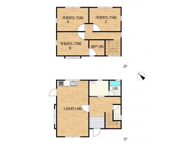 | 詳細間取 | 3LDK (2階:5.7帖×3、1階:LDK14帖) | ||